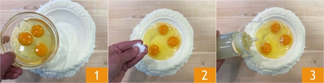 Para preparar los tagliolini alcachofas y gambas, primero disponed la harina en forma de volcán y poned en su interior los huevos 1, luego añadid una pizca de sal 2 y una cucharada de aceite 3.