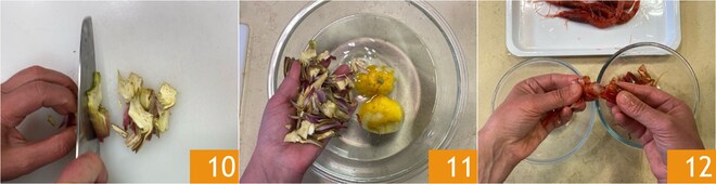 Cortad las alcachofas en rodajas 10 y, a medida que lo hacéis, sumergidlas en agua acidulada 11. Para la Cómo limpiar los gambones, primero separad la cabeza 12.