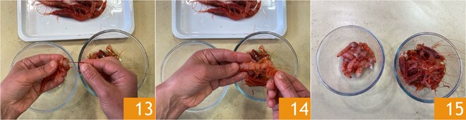 Eliminad el intestino 13 y el caparazón 14. Reservad tanto la pulpa como las cabezas y los caparazones, en 2 cuencos separados 15.