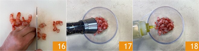 Cortad las gambas en trozos 16 y trasladadlas a un cuenco pequeño, luego sazonad con sal, pimienta 17 y aceite 18.