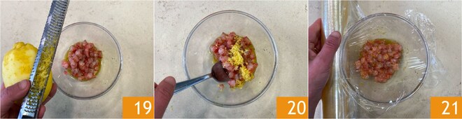 Añadid la ralladura de limón 19 y mezclad 20. Cubrid con film 21 y dejad marinar en la nevera hasta el momento de su uso.
