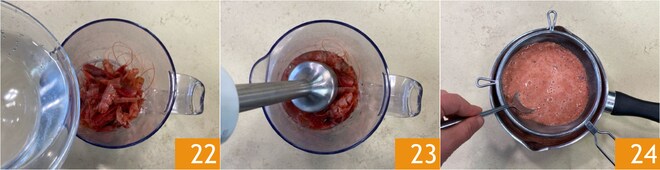 Poned las cabezas y los caparazones en un vaso, añadid un poco de agua 22 y triturad con una batidora de mano 23. Filtrad la salsa a través de un colador en un cazo 24.