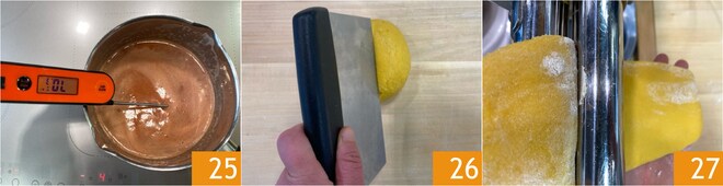 Calentad la mezcla hasta 70°C y reservad 25. Transcurrido el tiempo de reposo de la pasta, retomad la masa y divididla a la mitad 26. Pasad la primera porción una vez en la laminadora 27, cuidando de mantener la otra envuelta en film para evitar que se seque.