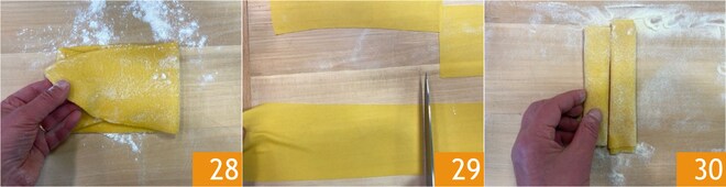 Dad dobleces de refuerzo 28 y continuad disminuyendo el grosor de los rodillos hasta obtener 2 láminas de 1 mm de grosor. Divididlas a la mitad 29, luego enrollad comenzando por los lados cortos hacia el centro, formando dos cilindros 30.