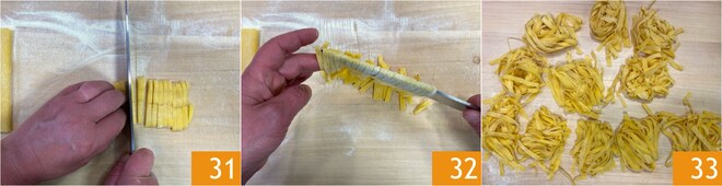 Cortad los cilindros en tiras de 4-5 mm de ancho 31. Desenrollad las fettuccine 32 y enrolladlas varias veces alrededor de los dedos hasta formar nidos. Reservad 33.