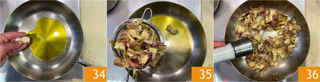 En una sartén, calentad un poco de aceite, añadid el ajo 34 y sofríed durante un minuto. Incorporad las alcachofas bien escurridas 35 y ajustad de sal 36 y pimienta. Saltead durante 5-7 minutos a fuego medio-alto.