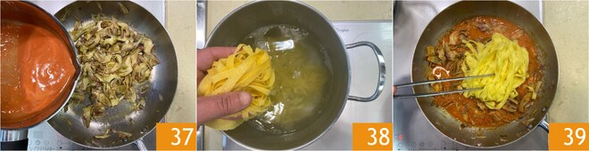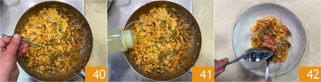 Eliminad el ajo, añadid la salsa de gambas 37 y mezclad. Mientras tanto, coced la pasta en abundante agua salada durante 2-3 minutos 38. Escurrid las fettuccine directamente en la sartén 39 y amalgamad bien.