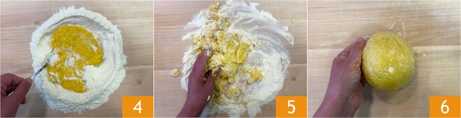 Incorporad poco a poco la harina primero ayudándoos con un tenedor 4 y luego con las manos 5 hasta obtener una masa lisa y homogénea. Envolvedla en film 6 y dejad reposar en la nevera al menos 30 minutos.