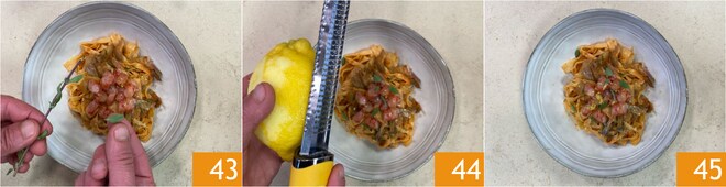 Adornad con algunas hojas más de mejorana 43 y una pizca de ralladura de limón 44. ¡Vuestras fettuccine alcachofas y gambas están listas para ser servidas 45!