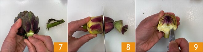 Mientras tanto, ocupáos de la Cómo limpiar las alcachofas: eliminad las hojas más externas y duras 7, luego cortad las puntas 8. Dividid las alcachofas por la mitad y eliminad la pelusa interna 9.