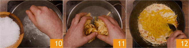 Ponga una olla con abundante agua salada en el fuego 10 donde cocerá las fettuccine al dente 11. Tan pronto como las fettuccine estén casi cocidas, escúrralas y mézclelas directamente en la cacerola con la salsa de verduras 12.