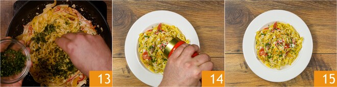 Complete con perejil fresco 13 y un poco de pimienta recién molida 14. ¡Sirva inmediatamente sus fettuccine con pimientos 15!