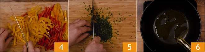 Corte los pimientos en bastones 4 y pique el perejil 5. Caliente en el fuego una sartén con un chorrito de aceite 6.
