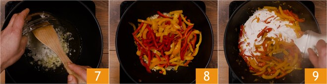 Agregue la cebolla y déjela pochar 7. Cuando esté bien blanda, añada los pimientos y cocine a fuego medio durante 10-15 minutos 8. Ajuste de sal, vierta la nata 9 y termine de cocinar la salsa a fuego bajo.
