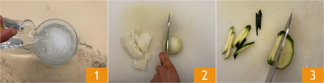 Para preparar los fideos de soja salteados, pon los fideos en remojo en agua tibia durante 30 minutos, mejor aún si se dejan toda la noche en agua fría 1. Limpia y corta la cebolla en rodajas 2, corta los calabacines en bastones 3.