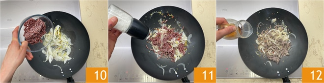 Vierte la carne picada 10, sala 11, pimienta y saltea por un instante, luego deja que se dore y rocía con el vino de arroz 12.