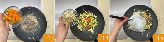 Agrega también las verduras 13 y los brotes de soja 14. Escurre aquí los fideos remojados 15, añade también el agua. Mezcla para dar sabor.