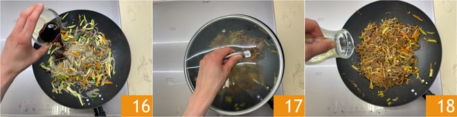 Ahora vierte la salsa de soja oscura 16 y luego también la clara. Vierte el agua, mezcla nuevamente para amalgamar, cubre con la tapa 17 y cocina durante 5 minutos. Por último, añade un poco de aceite de semillas 18.