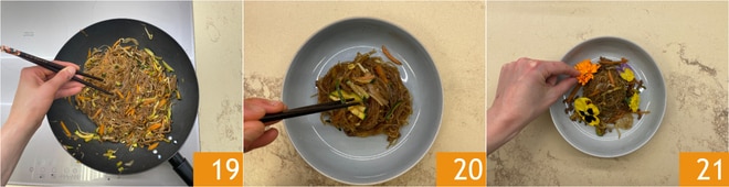Saltea una última vez 19, sirve los fideos de soja 20 adornando los platos con las flores comestibles 21.
