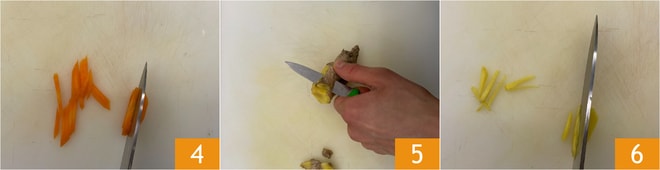 Limpia y corta en bastones también la zanahoria 4. Pela el jengibre 5 y redúcelo a bastones 6.