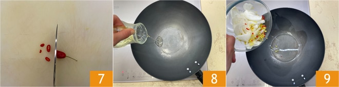 Corta el chile en tiras 7. En el wok, vierte un poco de aceite 8, echa aquí las cebollas, el jengibre y el chile 9. Deja que se pochen durante unos minutos.