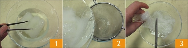Para preparar los fideos de soja, primero colócalos en remojo en agua tibia durante 30 minutos 1, luego escúrrelos 2 y córtalos con unas tijeras si son demasiado largos 3.