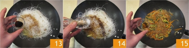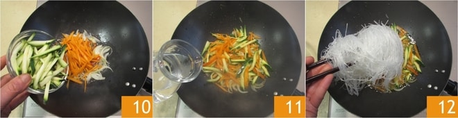 Añade también los calabacines 10, mezcla y saltea durante un minuto. En este punto, vierte el agua 11 y los fideos de soja 12.