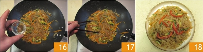 Por último, añade el aceite de semillas, que dará un color brillante 16. Da una última mezcla 17 y sirve tus deliciosos fideos de soja 18!