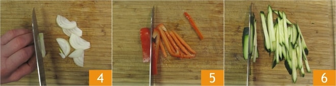 Mientras tanto, limpia y corta en tiras las cebollas 4, los pimientos 5 y los calabacines 6.