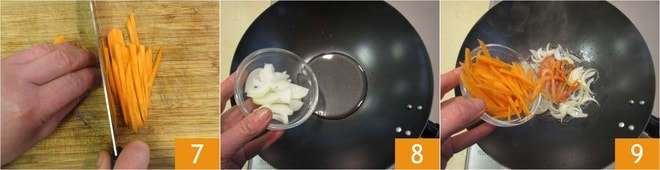 Haz lo mismo con las zanahorias 7. Calienta el wok a fuego alto, luego echa el aceite de semillas y las cebollas 8 y sofríe durante un minuto. Cuando las cebollas estén doradas, añade los pimientos y las zanahorias 9.