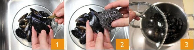 Para preparar la fideuà, comienza con la Cómo limpiar y abrir los mejillones: ponlos en un recipiente grande, enjuágalos bien bajo agua fría corriente, con el dorso de la hoja de un cuchillo elimina todas las incrustaciones y los percebes (parásitos que se forman en la concha) y, de manera enérgica, arranca la barba (o biso) que sobresale de las valvas 1. Con una esponja de acero, frota enérgicamente los mejillones para eliminar cualquier impureza 2. En este punto, pon los mejillones en una olla a fuego vivo y cúbrelos con una tapa 3: se abrirán en unos 5 minutos.