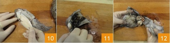 Una vez extraído el hueso 10, intenta localizar la bolsa de tinta y, si está presente, extráela con mucho cuidado 11, tomándola con los dedos pero sin aplastarla, para no romperla y evitar así la salida de la tinta. Luego separa la cabeza del cuerpo de la sepia 12, sosteniendo este último con una mano y con la otra tirando de la parte de los tentáculos.