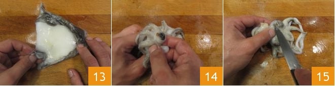 Luego elimina las pequeñas apéndices internas 13; retira la piel, haciendo una pequeña incisión y tirándola con las manos. Quita el pico, es decir, el diente o pico, situado en el centro de los tentáculos 14, presionando con los pulgares en la parte inferior del pico para empujarlo hacia arriba. Con un cuchillo pequeño también quita los ojos, cortándolos de manera circular alrededor del bulbo 15, luego extráelos.