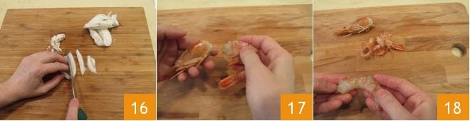 Finalmente, corta las sepias en tiras y resérvalas 16. Continúa con la limpieza de los gambones: quita la cabeza 17, el caparazón 18,