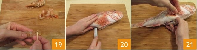 y extrae el intestino delicadamente con un palillo 19. Pasa luego a limpiar el cabracho: abre el vientre del pescado con un cuchillo o tijeras 20 y retira las vísceras 21.