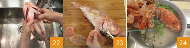 Enjuágalo bien bajo el agua corriente 22, luego corta las aletas con las tijeras 23; colócalo en una olla grande junto con un diente de ajo, perejil, tomillo y algunas pimientas, luego cúbrelo con agua (unos 2,5 litros) y ponlo a cocer a fuego bajo, junto con los desechos de los pescados limpios 24, para obtener un excelente caldo de pescado.