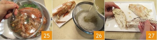 Cubre la olla con una tapa 25 y deja cocer por unos 30 minutos. Una vez cocido, extrae el cabracho del agua aún intacto, déjalo templar, filtra el caldo obtenido 26 y resérvalo. Luego desespina el pescado 27,
