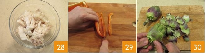 y reserva la carne 28. Lava bien los pimientos bajo abundante agua fresca corriente y sécalos con papel absorbente. Elimina la parte superior, luego con un cuchillo quita los filamentos blancos y las semillas que se encuentran en el interior; en este punto corta el pimiento en tiras 29. Limpia entonces las Cómo limpiar las alcachofas: elimina las hojas externas más duras 30, siguiendo hasta aquellas más tiernas;