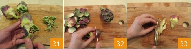 quita la parte final (que es la más dura) y de la parte restante del tallo retira las posibles espinas 31, luego elimina la capa externa fibrosa 32. También elimina la pelusa interna, es decir, la barba de la alcachofa, luego reduce los corazones a tiras 33.