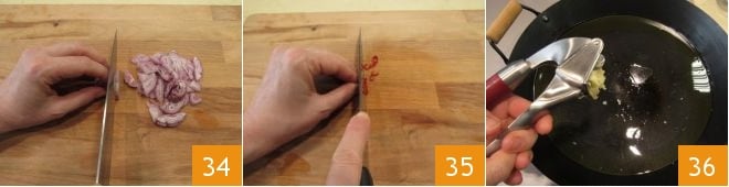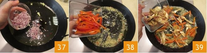 Agrega el chalote 37 y el chile picados, déjalos pochar, luego añade los pimientos 38, las alcachofas 39,