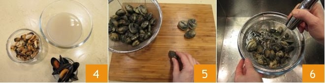 Una vez listos, con un colador filtra el agua de los mejillones y resérvala, porque te servirá para la cocción de la pasta. Desconcha los mejillones 4 (recordando dejar algunos enteros para añadir al plato como decoración). Pasa luego a las almejas: primero verifica que no contengan arena, golpeándolas una a una sobre una tabla de cortar por la parte de la apertura 5; si sale arena oscura significa que las almejas deben ser desechadas. Luego colócalas en un colador apoyado sobre un bol y enjuágalas varias veces bajo agua corriente 6, hasta que no quede arena en el bol.