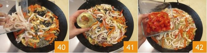 y las sepias 40 y deja cocinar hasta que los pimientos estén tiernos pero aún intactos. Riega con el vino blanco 41, luego añade los tomatitos 42, déjalos ablandar, y sala ligeramente.