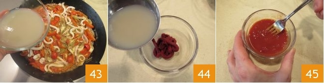 Añade una parte del caldo 43, luego diluye el concentrado de tomate en un poco de caldo y de líquido filtrado de los mejillones y las almejas 44, mezcla 45 y resérvalo.