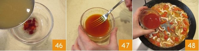 Diluye también el azafrán con un poco de caldo y líquido de cocción de los pescados 46, mezcla 47 y resérvalo. Añade entonces el concentrado de tomate 48,