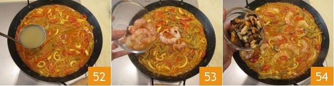 Cúbrelos con el caldo 52 y cocina la pasta como si fuera un risotto, agregando poco caldo a la vez, cuando sea necesario, y revolviendo con frecuencia. Cinco minutos antes de que termine la cocción de los espaguetis, añade los gambones 53, y después de dos minutos los mejillones 54