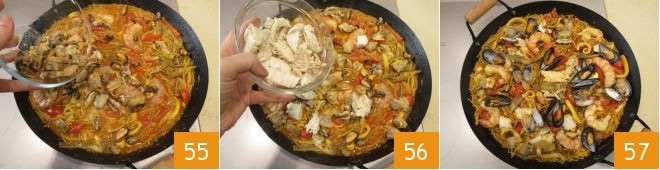 y las almejas 55. Añade finalmente la carne del cabracho 56, ajusta de sal, pimienta y deja secar los líquidos de cocción. Cuando la pasta esté al dente, apaga el fuego y sirve tu fideuà, decorando con los mejillones enteros que has reservado 57.