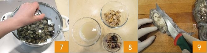 Escurre bien las almejas y viértelas en una olla amplia: cúbrelas con la tapa 7 y enciende el fuego fuerte: de este modo las valvas se abrirán con el calor. Apaga el fuego inmediatamente después de la apertura completa, para no comprometer la ternura del marisco con una cocción demasiado prolongada. Escurre las almejas, desconchadas y conserva el líquido de cocción 8. Dedícate entonces a la Cómo limpiar las sepias primero, usa guantes de látex. Presionando ligeramente con los dedos sobre el vientre del molusco, intenta localizar el hueso y con la ayuda de un cuchillo realiza un corte transversal 9.
