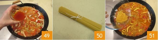 y el azafrán diluido 49, luego pesa los espaguetis 50 y comienza a romperlos en un bol manteniendo una longitud de unos 3 cm, y viértelos en la sartén 51.