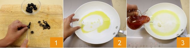 Para preparar el filete de platija a la sorrentina, corta las aceitunas negras en rodajas 1 y pon al fuego una sartén antiadherente con el aceite y el diente de ajo 2. Vierte la salsa de tomate 3,