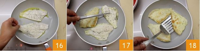 cuando el aceite esté caliente, dora los filetes 2 minutos por cada lado 16, dándolos la vuelta con unas pinzas de cocina para una cocción uniforme 17. Una vez listos 18, apaga el fuego,